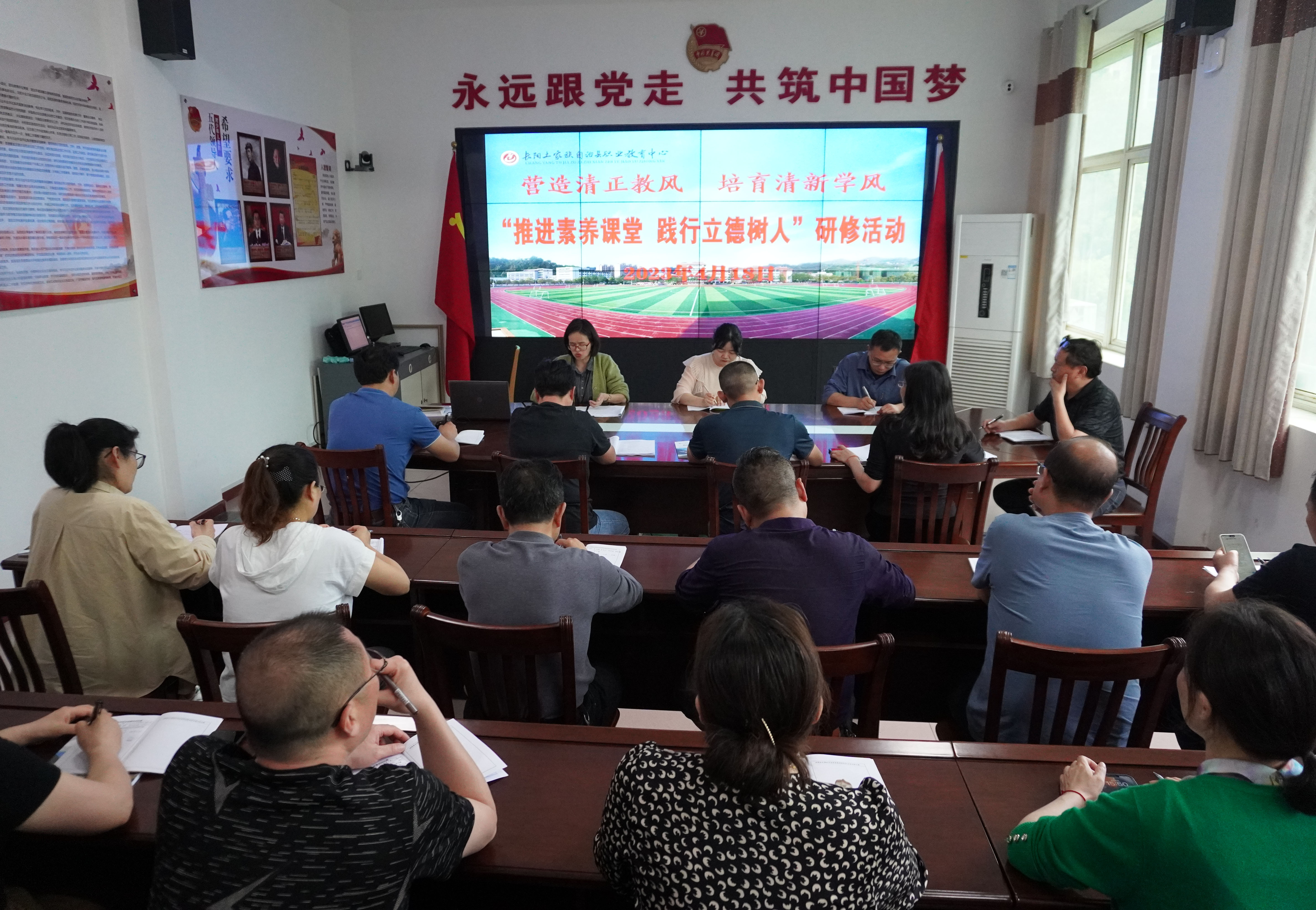 4月18日全体教师开展以“推进素养课堂,践行立德树人”为研修主题校本研修活动,聚焦素养课堂教学,教研组长领学县教育局下发的《长阳“素养课堂”建设三年实施方案》和《长阳职教中心素养课堂建设实施方案》。