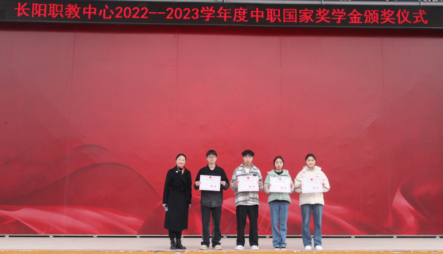 3月27日,长阳县职教中心隆重举行2022-2023学年度中职国家奖学金颁奖仪式。县教育局资助中心何芳艳同志为获得国家奖学金的4名同学颁发获奖证书。